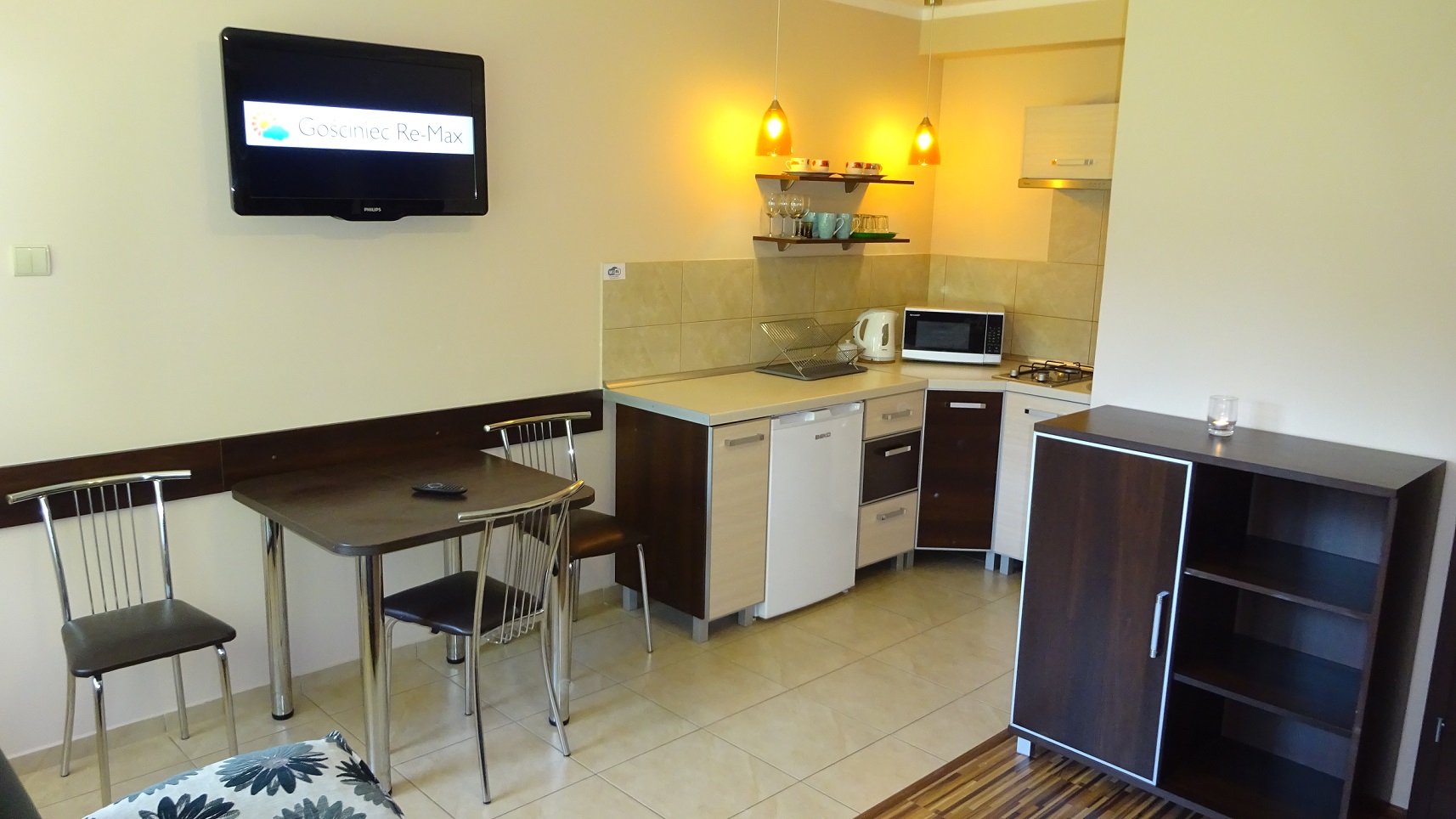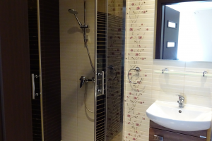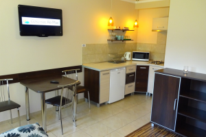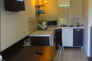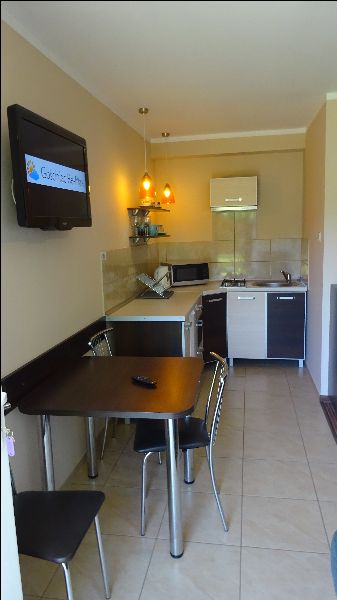 W apartamencie: łazienka (prysznic, WC, umywalka), TV - 32"cale, wyposażony aneks kuchenny (płyta indukcyjna, lodówka, mikrofala, czajnik).