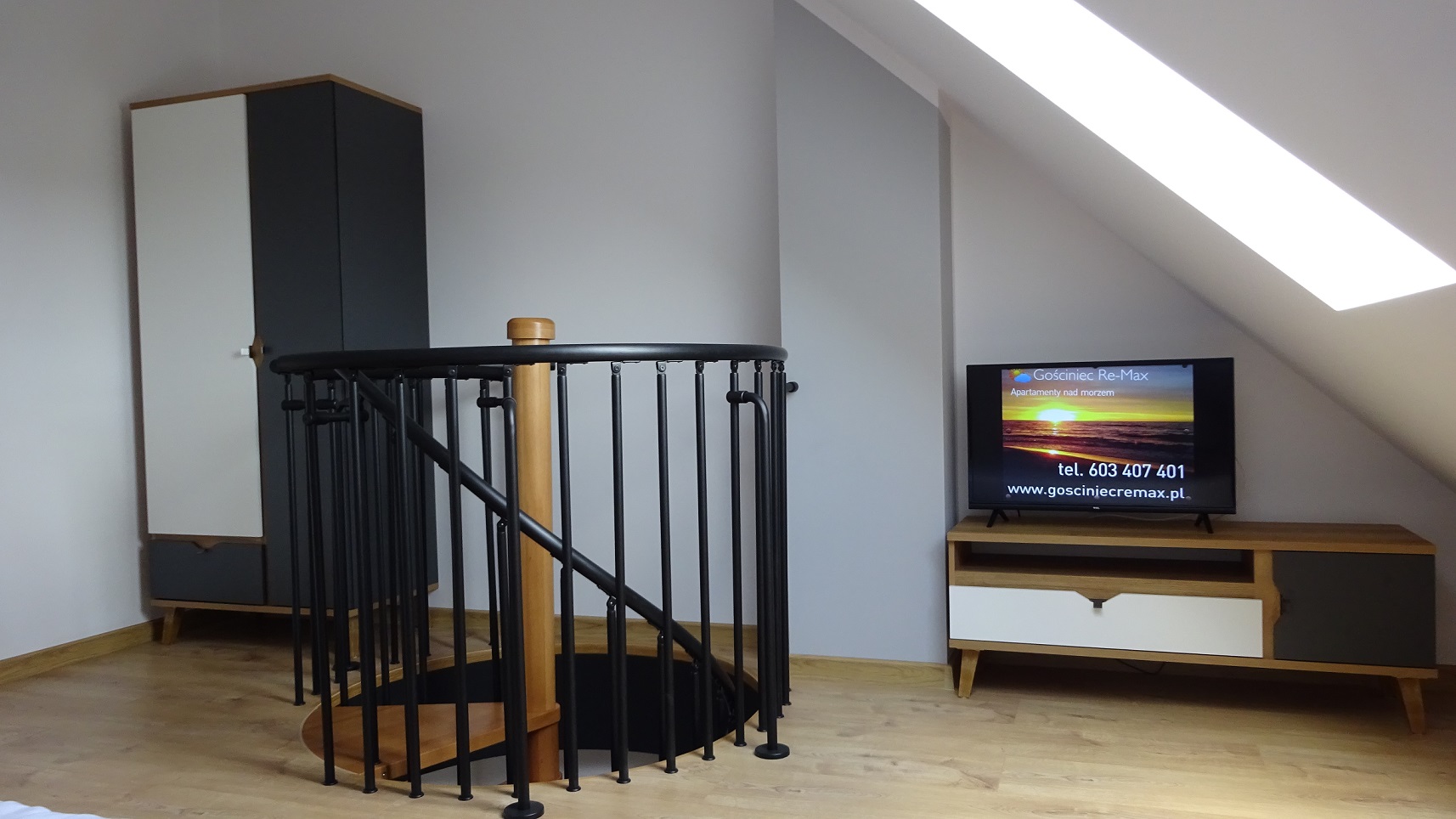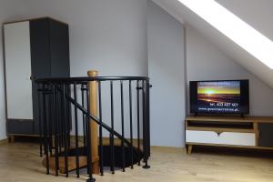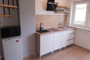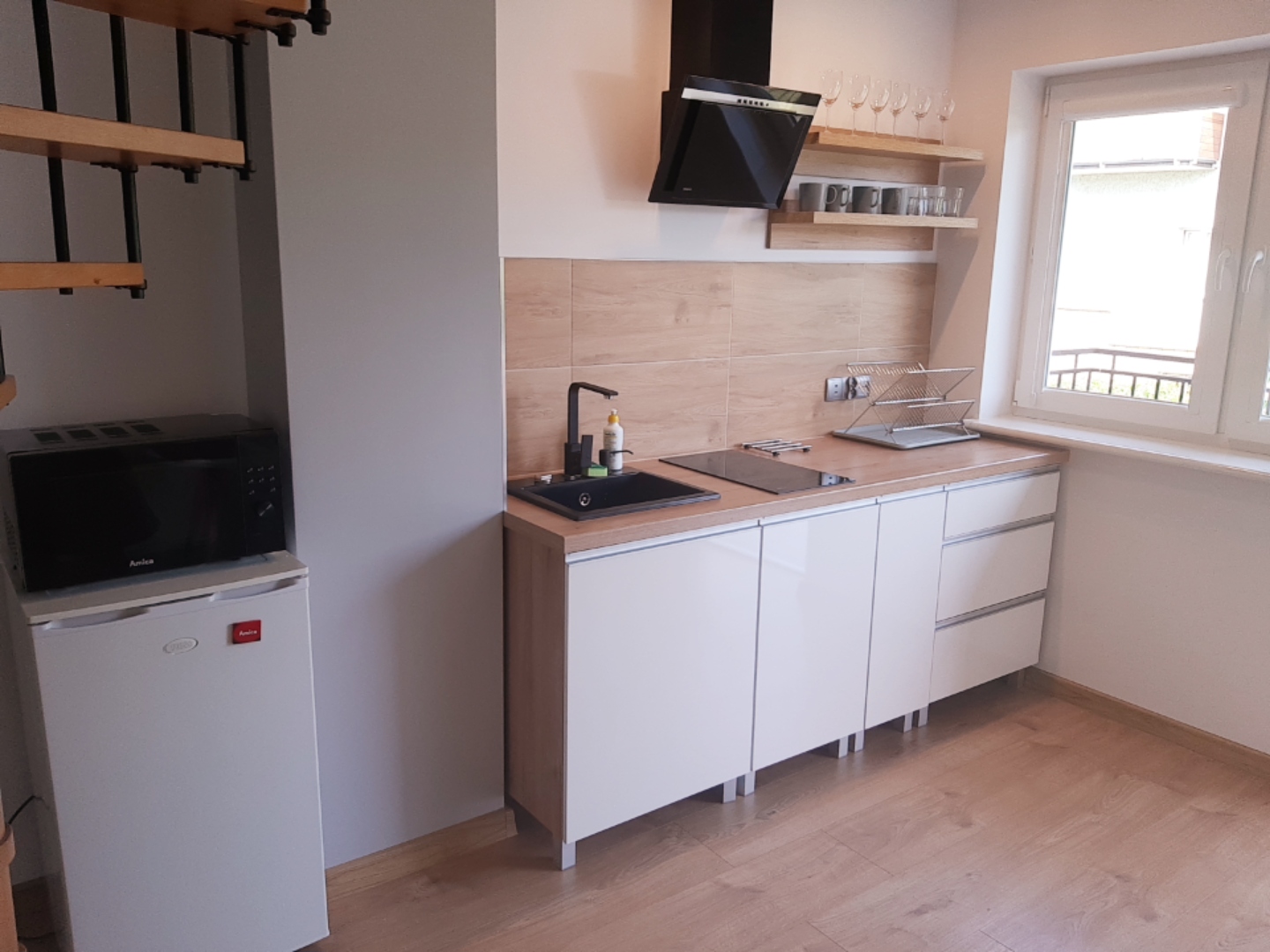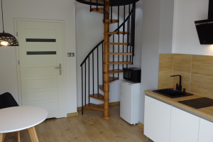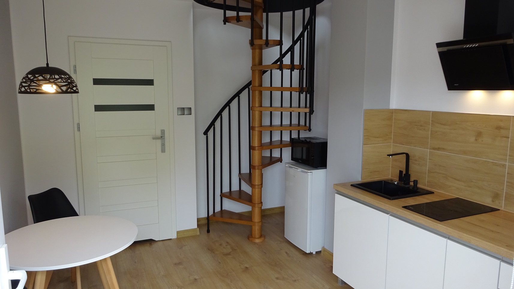 Nowy apartament 2 poziomowy (ok. 30m2) dla max. 2 os deluxe. W apartamencie: na 1-wszym poziomie: aneks kuchenny (płyta indukcyjna, mikrofala, lodówka, czajnik, zestaw naczyń), łazienka z podgrzewaną podłogą (wc, prysznic, umywalka), na piętrze sypialnia z łóżkiem małżeńskim, TV-32 cale. Przed apartamentem na tarasiku stolik i 2 krzesełka.