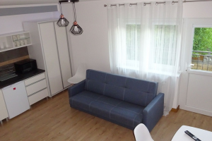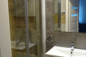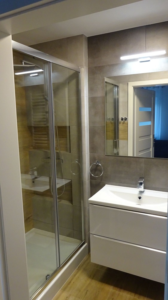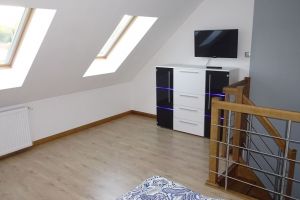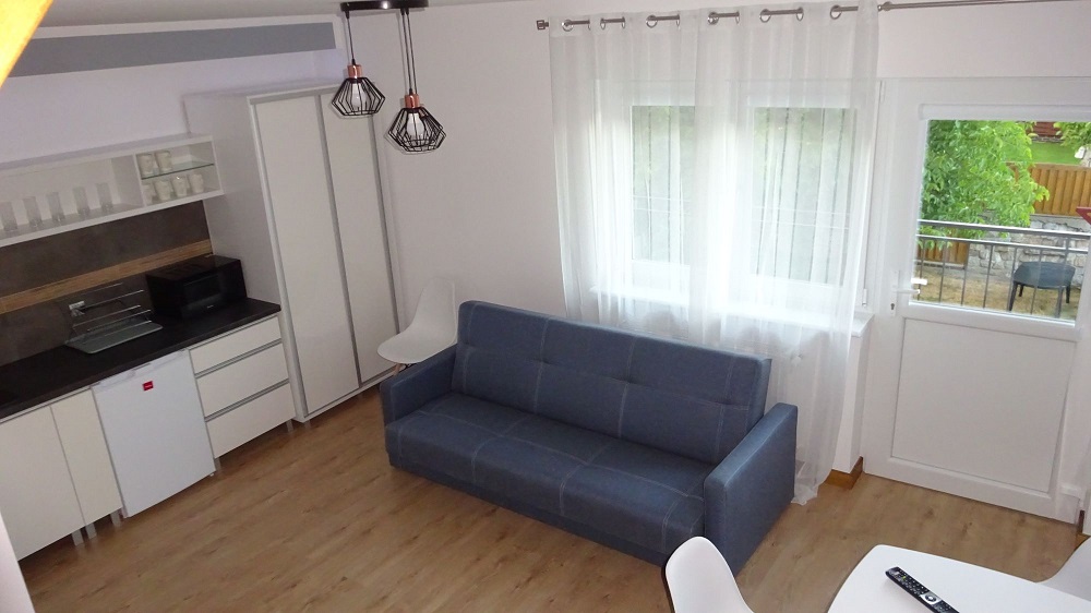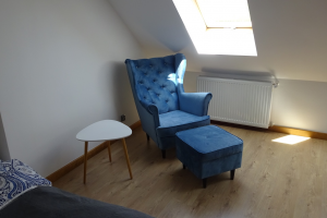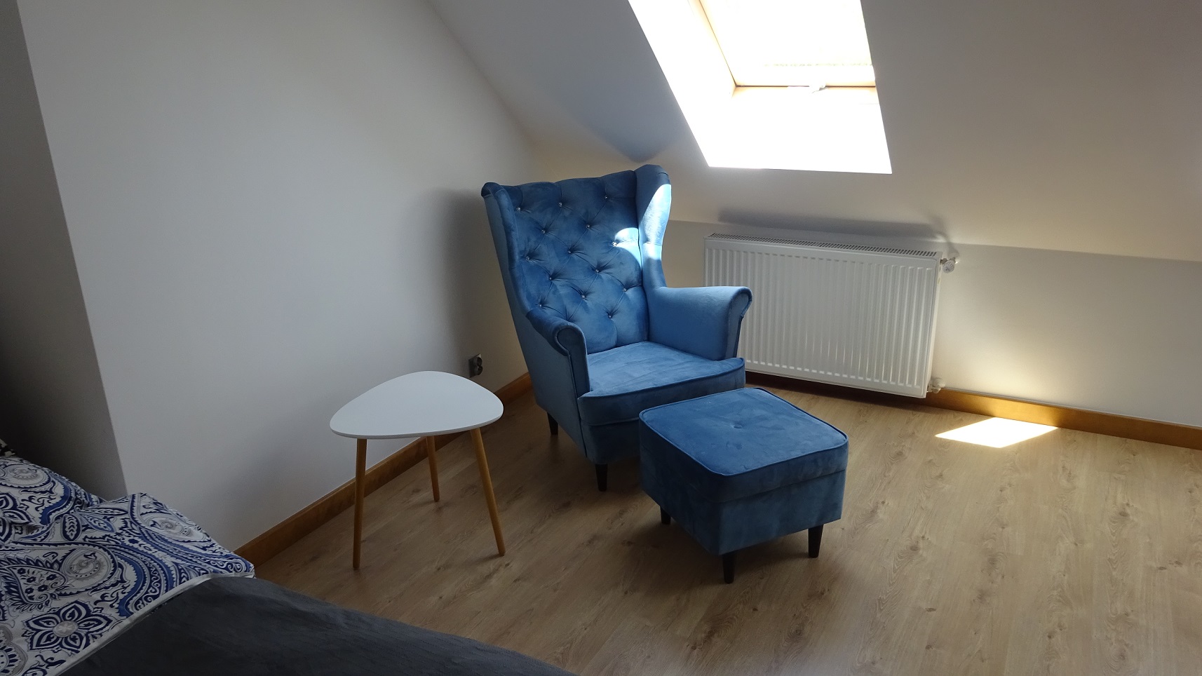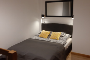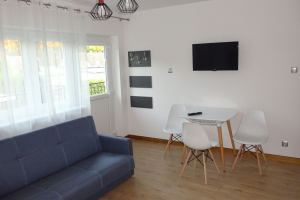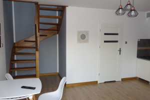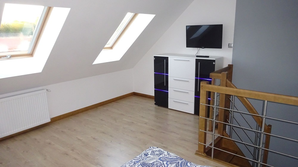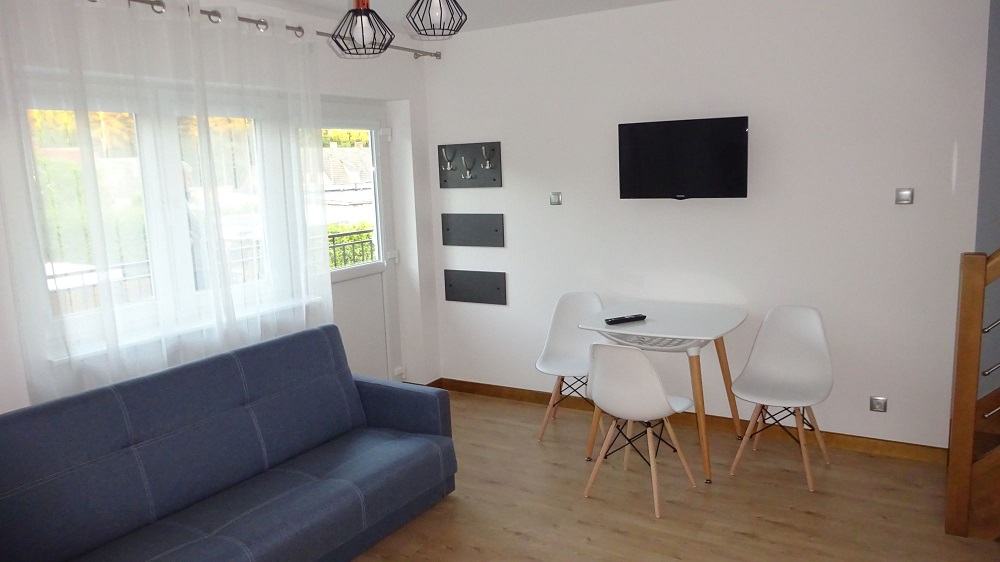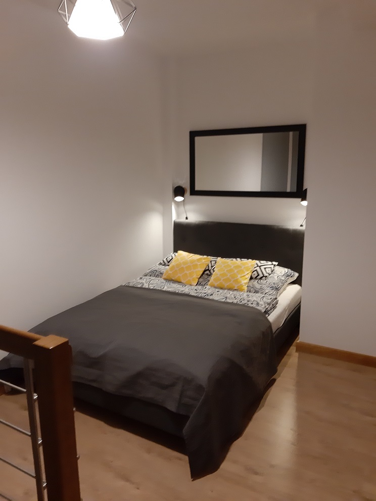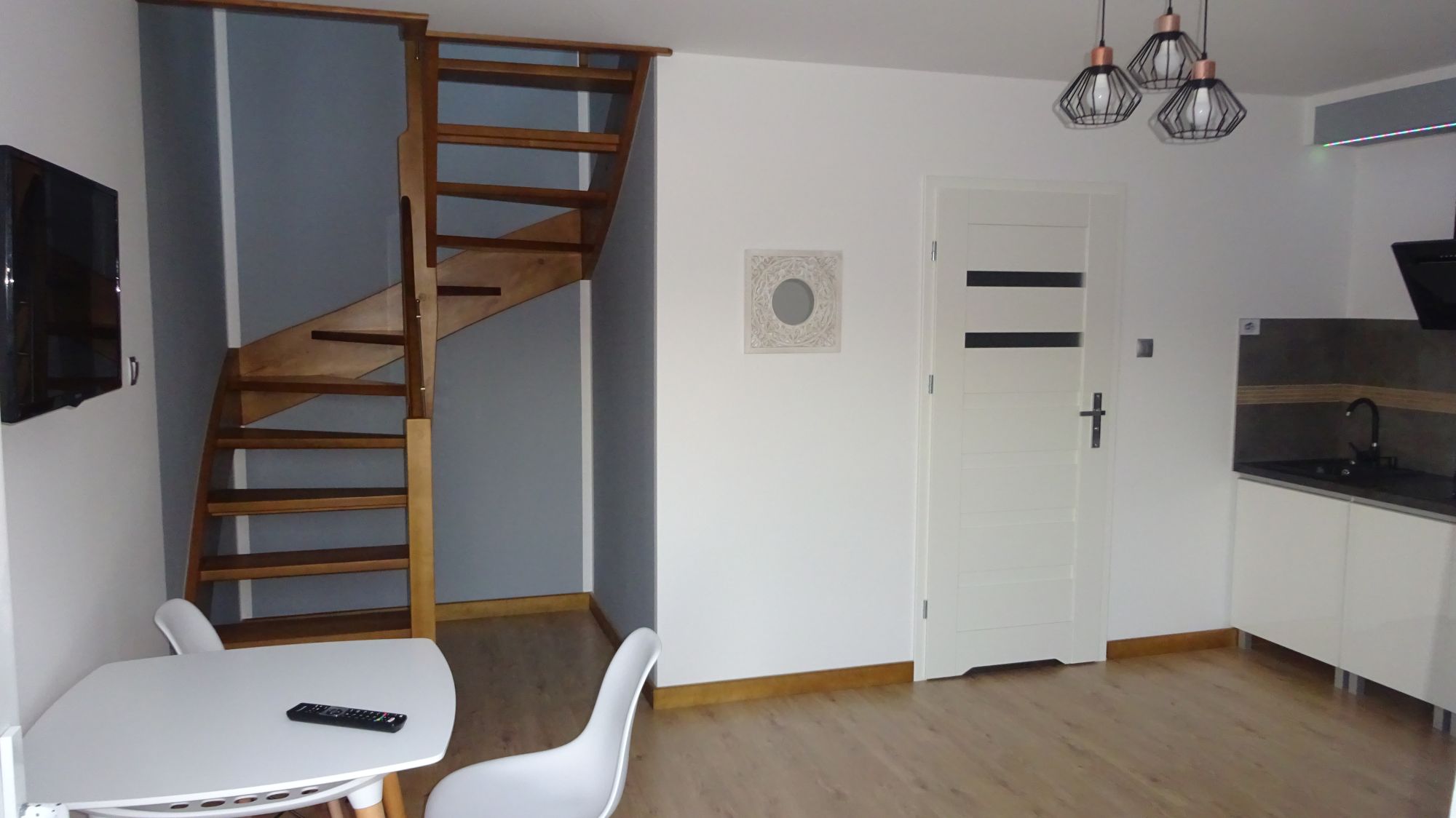 Nowy apartament 2 poziomowy (ok. 43m2) dla max. 4 os deluxe. W apartamencie: na 1-wszym poziomie: aneks kuchenny (płyta indukcyjna, mikrofala, lodówka, czajnik, zestaw naczyń), TV 32 cale, łazienka z podgrzewaną podłogą (wc, prysznic, umywalka), na piętrze sypialnia z łóżkiem małżeńskim, TV-32 cale. Przed apatamentem na tarasiku stolik i 2 krzesełka