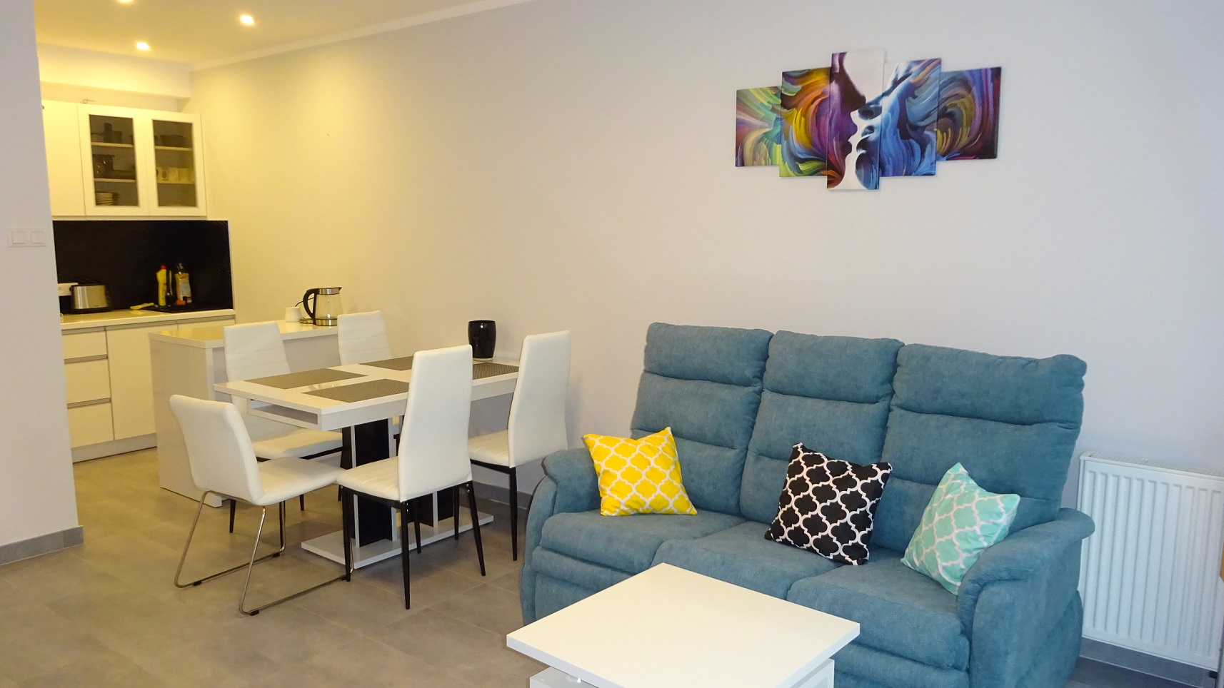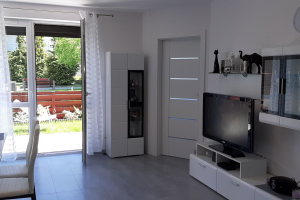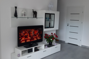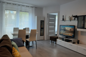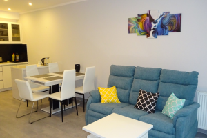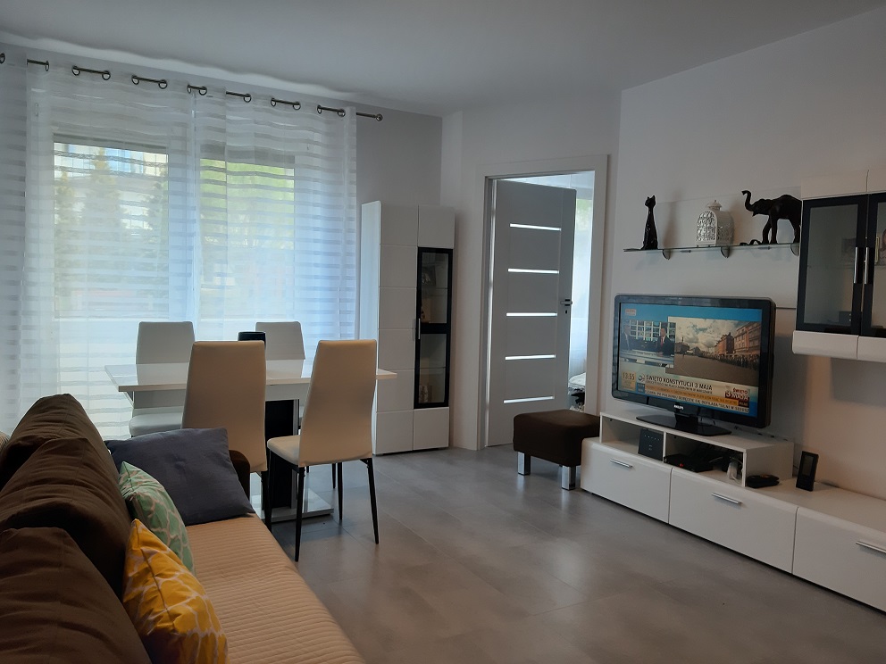 Apartament 2 pokojowy, 40 m2 dla max. 4 osób z oddzielną sypialnią. W salonie rozkładana sofa 2 os, TV - 32 cale, stół 4 os, obok aneks kuchenny (pływa indukcyjna, wbudowana lodówka, piekarnik z funkcją mikrofali, toster, zmywarka) i łazienka - prysznic, wc, umywalka.